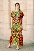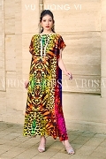 Chiếc váy được tạo nên từ lụa cao cấp mềm mịn, chất liệu sang trọng bậc nhất giúp tôn lên từng đường nét tự nhiên mà vẫn mang lại cảm giác thoáng nhẹ và thoải mái. Họa tiết được NTK Vũ Tường Vi thiết kế độc quyền, lấy cảm hứng từ vẻ đẹp hoang dã của rừng nhiệt đới – nơi sắc vàng của nắng, họa tiết da báo, và những dải màu rực rỡ hòa quyện tạo nên ảo ảnh thị giác đầy cuốn hút.